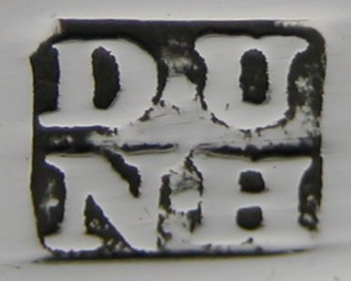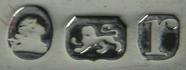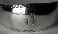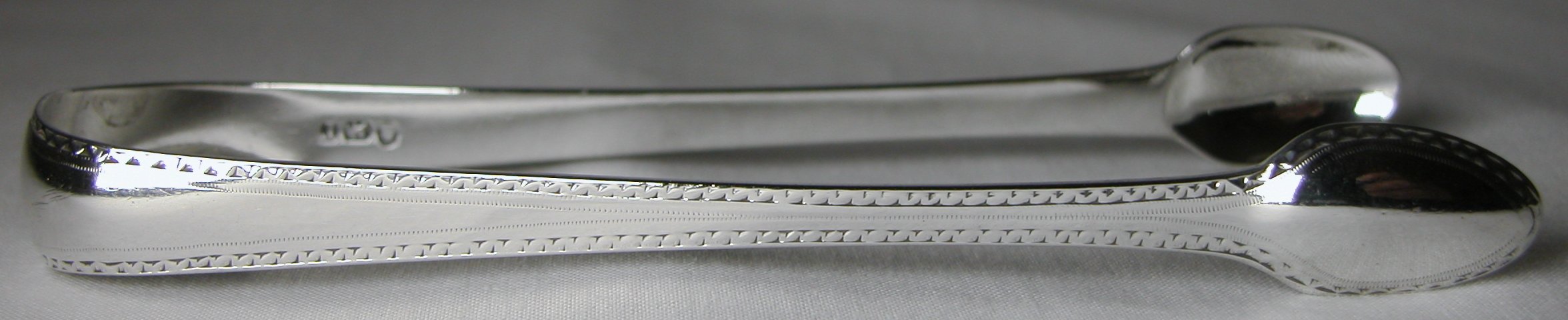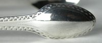 These are a pair of fairly standard shape and style bright cut sugar tongs. They are decorated with a simple feather edge engraving that extends around the bowls. The bowls are of a standard size. We see with later Urquhart & Hart tongs that they changed their style towards larger than normal bowls. The maker's mark has a pellet between the letters. Click on any picture to enlarge |