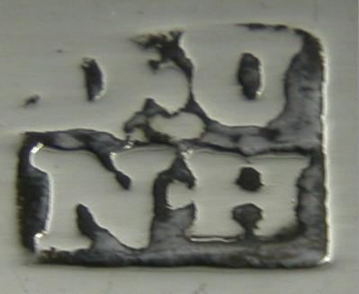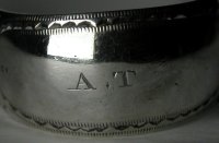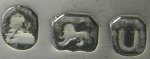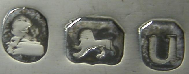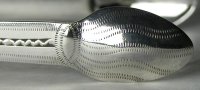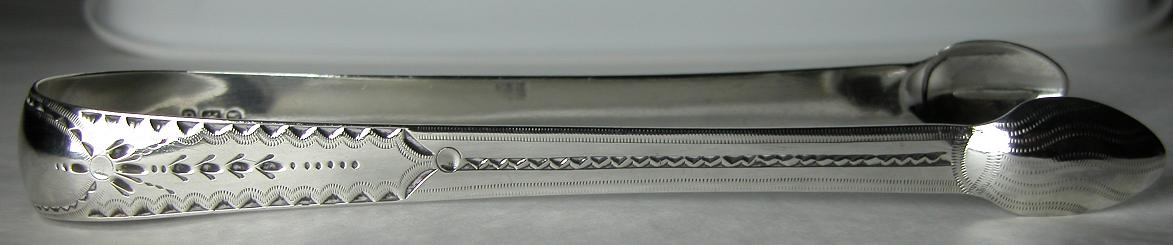 These are a pair of fairly standard shape and style bright cut sugar tongs. They have a prick dot pattern of wavy lines in the bowls which are of a standard size. We see with later Urquhart & Hart tongs that they changed their style towards larger than normal bowls. The maker's mark has a pellet between the letters. Click on any picture to enlarge |
