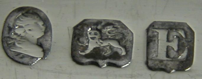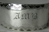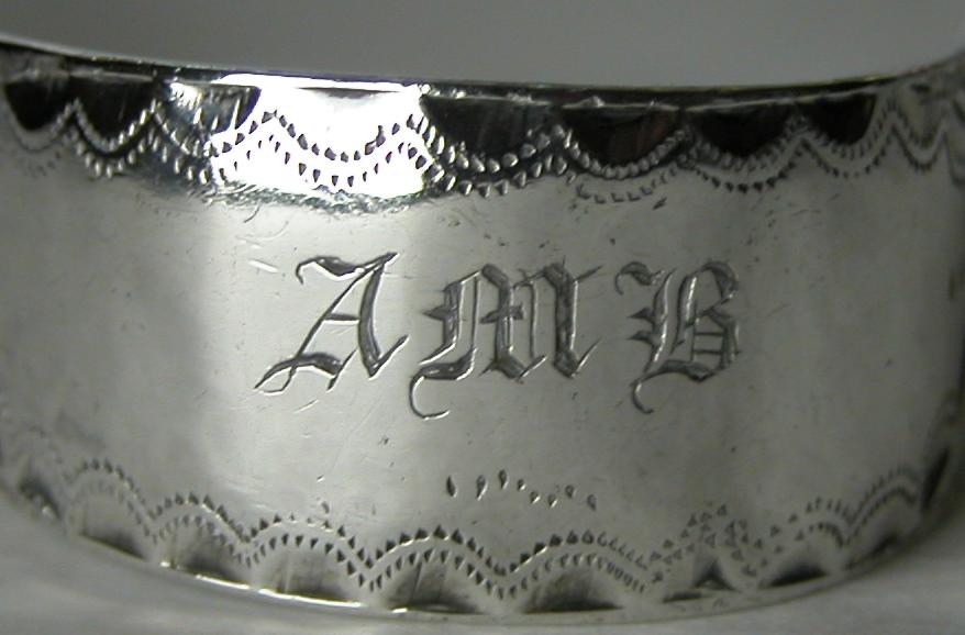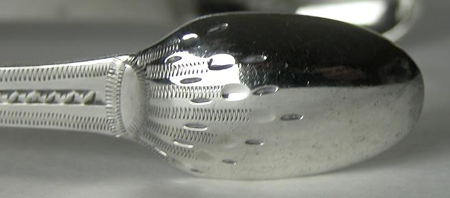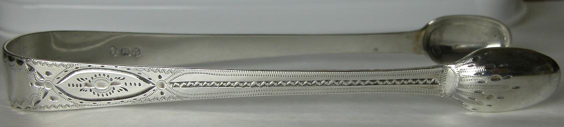 These are bright cut tongs, standard 5.½ inches in length, but notice that the bowls look a little large & chunky for the rest of the tongs. The monogram is probably a Victorian addition.
