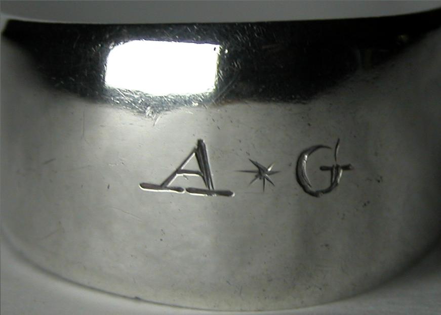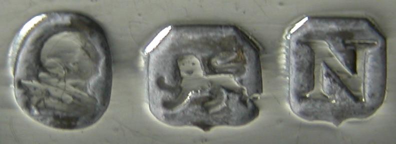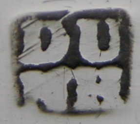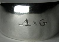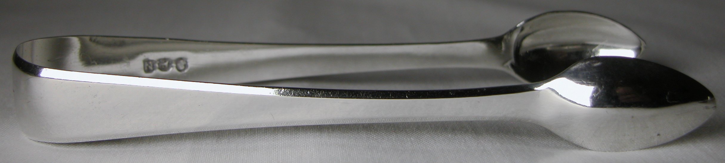 These are a lovely pair of completely plain tongs with a simple monogram. Georgian sugar tong makers were generally switching towards plain tongs at around this time & Urquhart & Hart were no different. Notice the maker's mark is again different - no pellets. Click on any picture to enlarge |