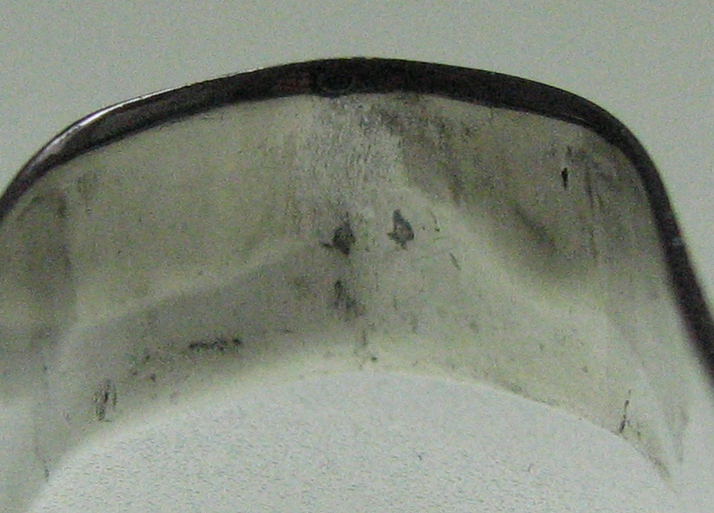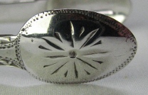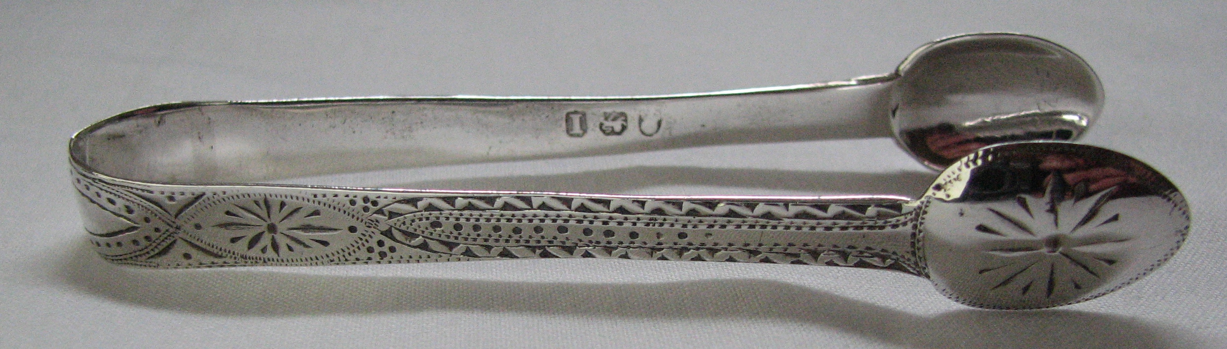 These are a particularly small pair of tongs, just 3.˝ inches or 9.2 cms long. The arms are narrow, in proportion with their overall size. They are very clearly hallmarked, in the normal place with good clear hallmarks for 1804 (between 29th May and 10th October). They “look” right in every respect. They have clearly been repaired at the bow. My view is that these tongs were actually made this size and have been repaired at some point in their life. This is as opposed to have been shortened at some time. Click on any picture to enlarge |