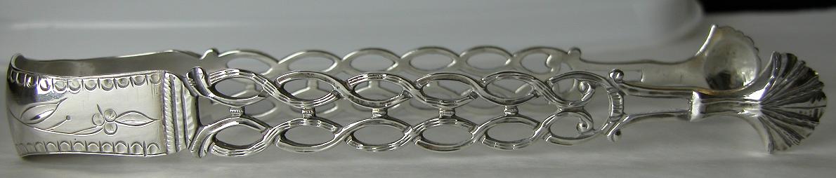 Elizabeth Taylor was a famous lady silver-smith. These sugar tongs are superb.; They have the distinction of being completely un-damaged. They have lovely clear hallmarks and a nice engraved monogram. Cast silver sugar tongs of this quality are very rare, especially made by a lady silver-smith. The quality of these tongs considerably increases their value.