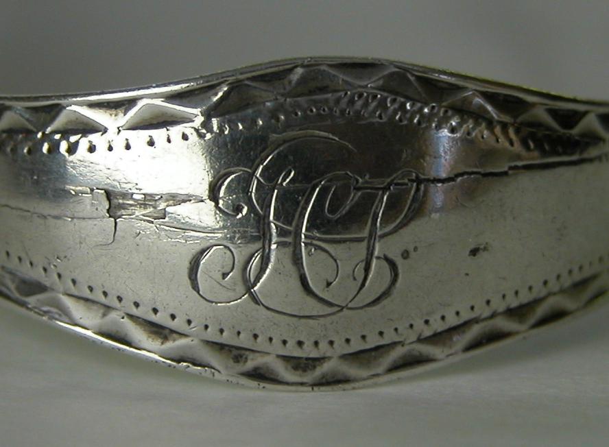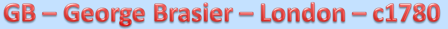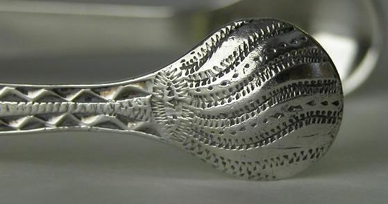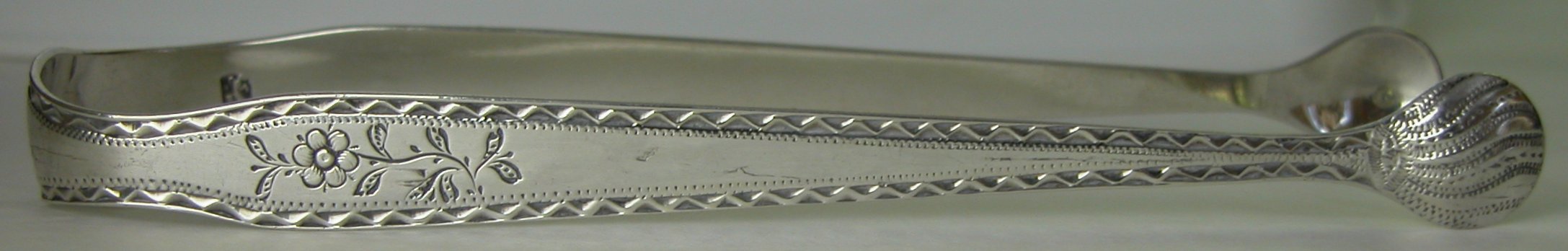 This pair of tongs to look at are a small, delicate pair of tongs with Adam style engraving to the top of the arms. These tongs have a small, circular bowl which is normal for the time, but unusual for George Brasier. These tongs are also much smaller than most other George Brasier tongs. These tongs are dated c1780. The maker’s mark on these tongs is distinctive as the “G” and the “B” are not straight and the mark looks as if it could be in an oval punch. Click on any picture to enlarge |