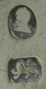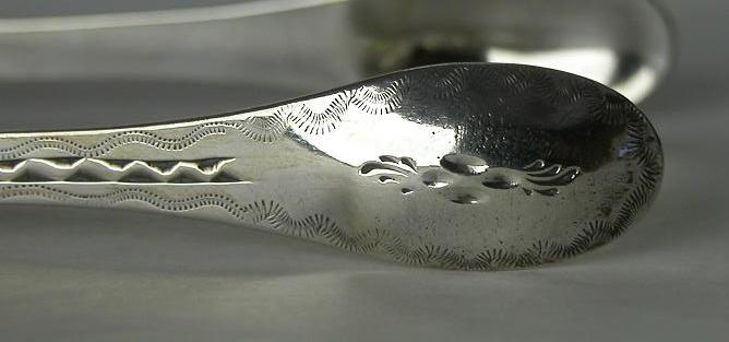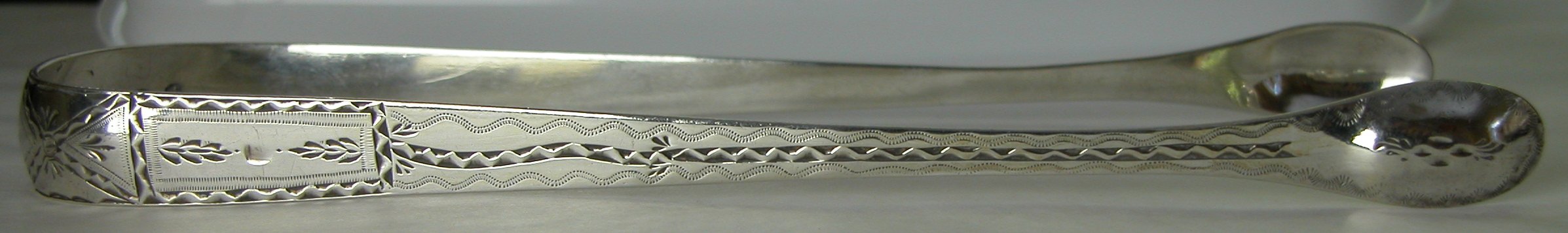 This pair of tongs is a bright cut example. They have the now familiar George Brasier oval bowls and are dated c1786 - 1790. These tongs are very long, being 6.¼ inches long. This is another feature of George Brasier tongs. Click on any picture to enlarge |