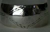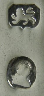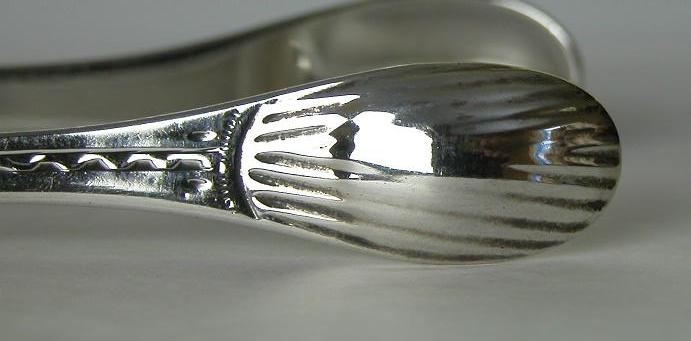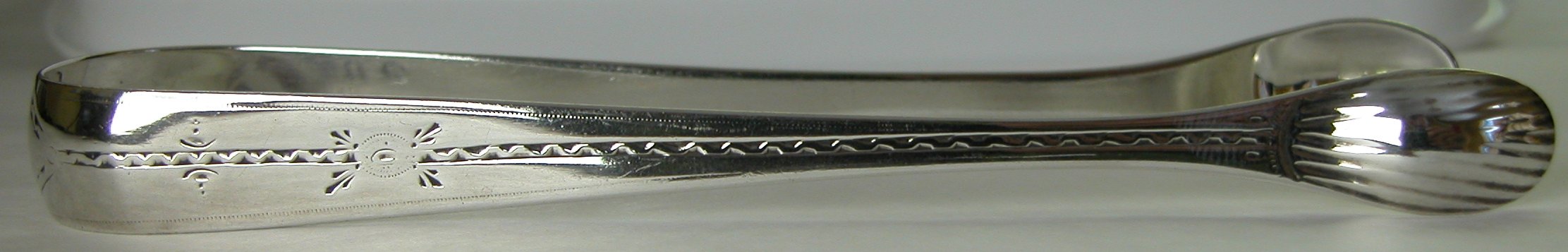 This pair of tongs is a bright cut example. They have the now familiar George Brasier oval bowls albeit engraved in a slightly different style. Again they are dated c1786 - 1790 and are very long, being 6.¼ inches long. This is another feature of George Brasier tongs. This pair has a very faded monogram, probably original. Click on any picture to enlarge |