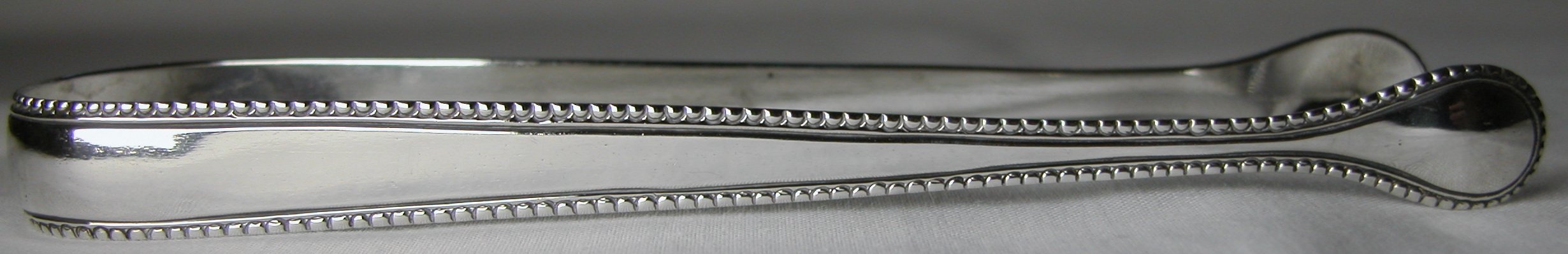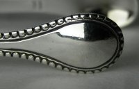 This is a delightful pair of early thread and beaded tongs. The design around the edge of the tongs passes around the bowls. The bow is slightly concave which is quite unusual. They also have a "H" engraved on the inside of one of the arms. I have dated these tongs c1780. Click on a picture to enlarge |