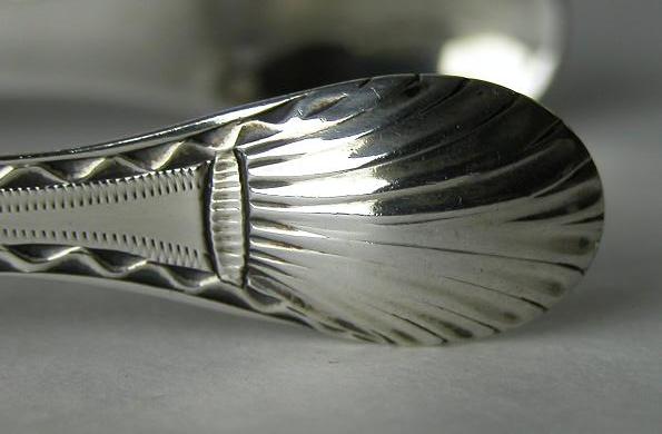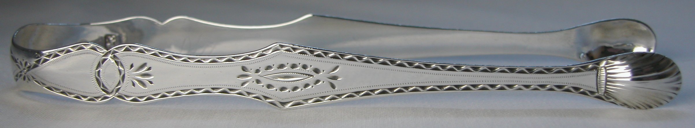 These are a lovely pair of shaped, bright cut tongs. They are dated c1780 - 1784.