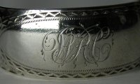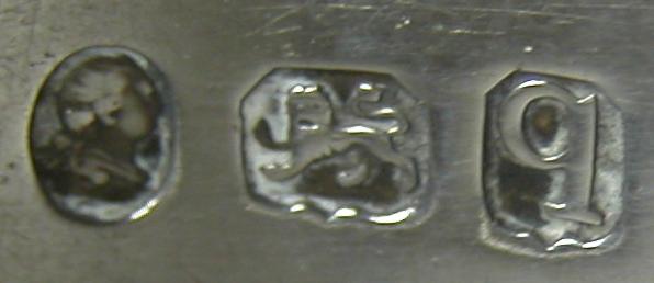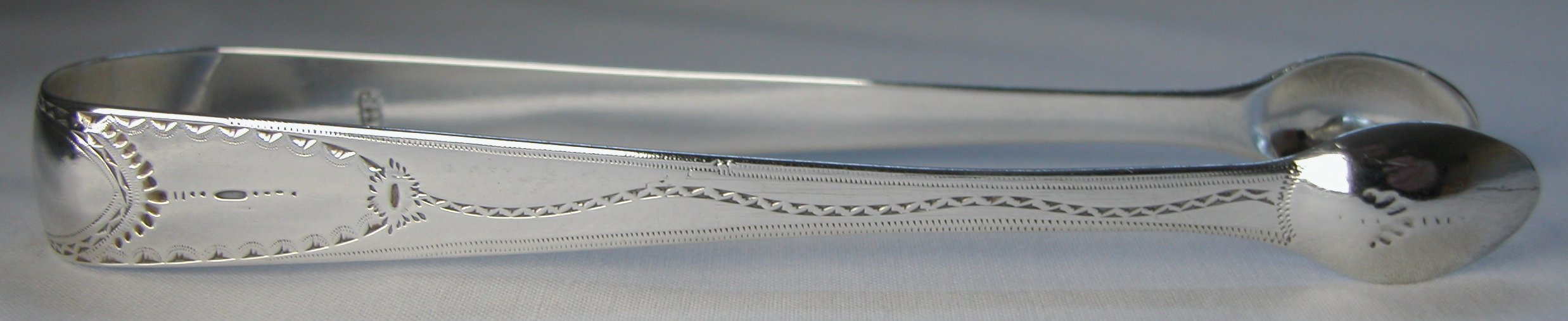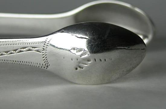These tongs are a standard pair of bright cut tongs. They are marked with the date letter "q". This was the first year that sugar tongs were marked with a date letter.