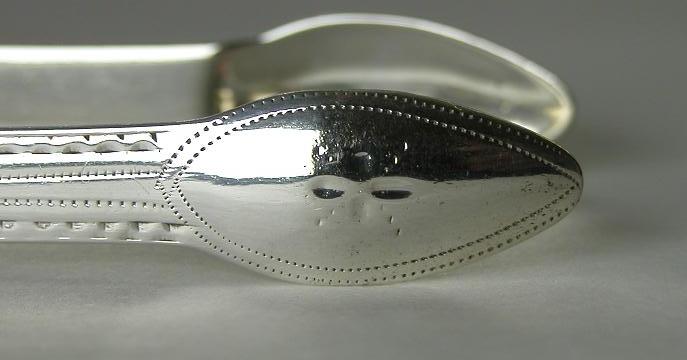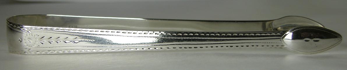 These tongs are a standard pair of bright cut tongs. These tongs have George Burrows' characteristic pointed bowls.