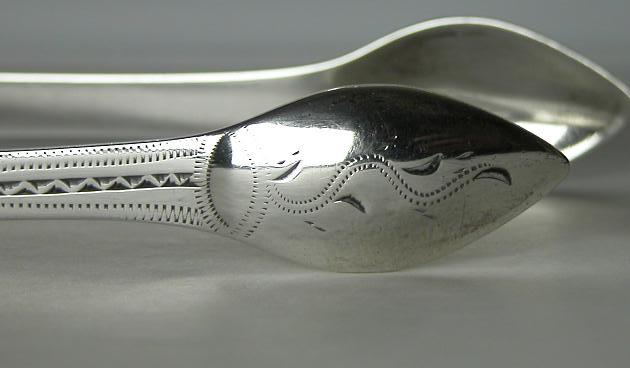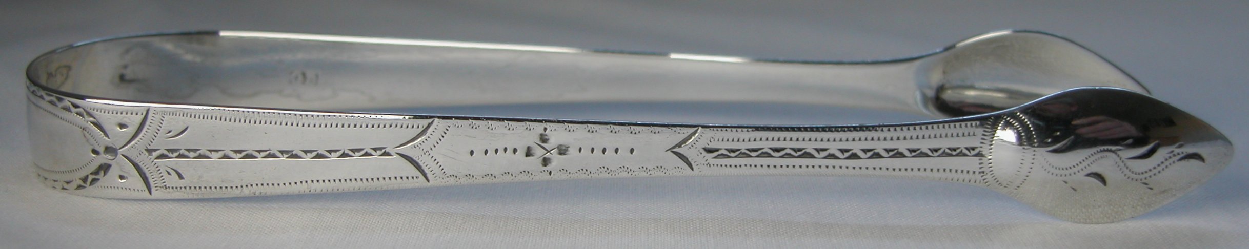 These tongs are a standard pair of bright cut tongs. Notice the pointed bowls which are a feature of George Burrows I