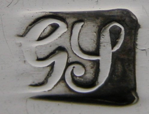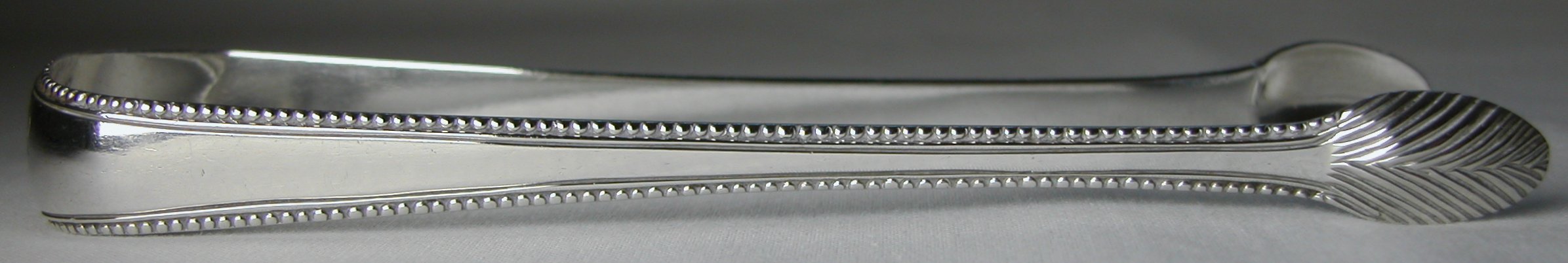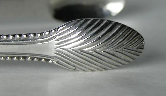 These are a fairly plain pair of thread and beaded edge tongs with oval bowls deeply engraved with a leaf vein pattern. I have tentatively dated them c1780. George Smith III maker's marks