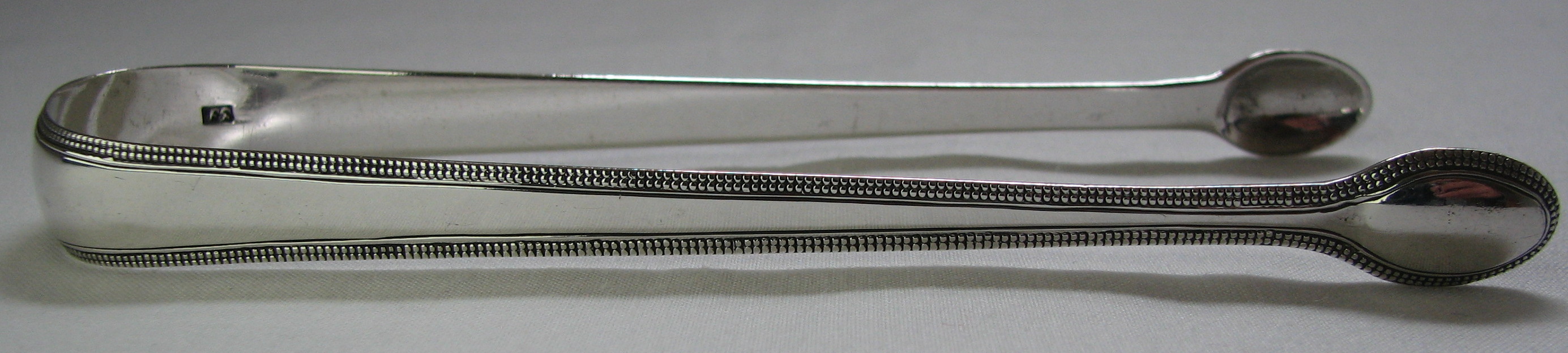 This pair of tongs is interesting in that they have a DOUBLE row of beading around the edges. This gives them a very different look to most beaded tongs. They are dated c1784. George Smith III maker's marks