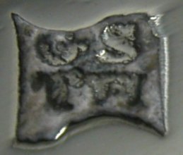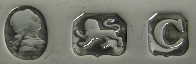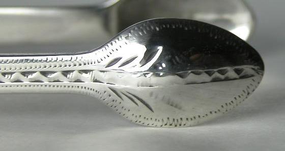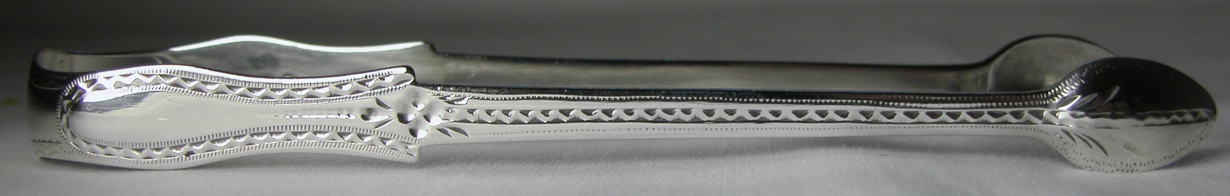 These tongs are a standard style pair of bright cut tongs but this pair has a lovely shape to the arms where they have been cut away at the tops of the arms to leave a very unusual shape. The maker's mark is the most commonly seen mark - punched with a poor punch. Click on any picture to enlarge |