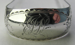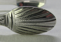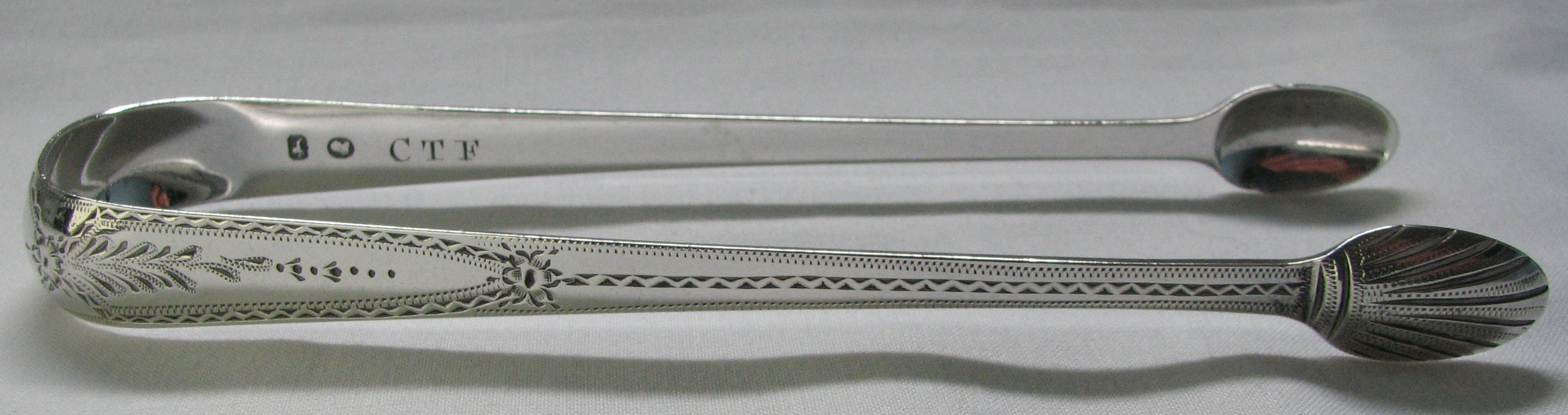 This is a lovely pair of bright cut engraved tongs with a concave bow and the characteristic deep cut lines to the bowls. They have a contemporary monogram. They are highly unusual in having two sets of initials engraved to the insides of the arms, one on each arm. My guess would be that these are marriage initials. They are dated between 1786 and 1790. Click on any picture to enlarge |