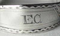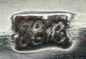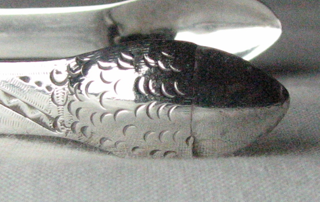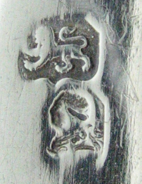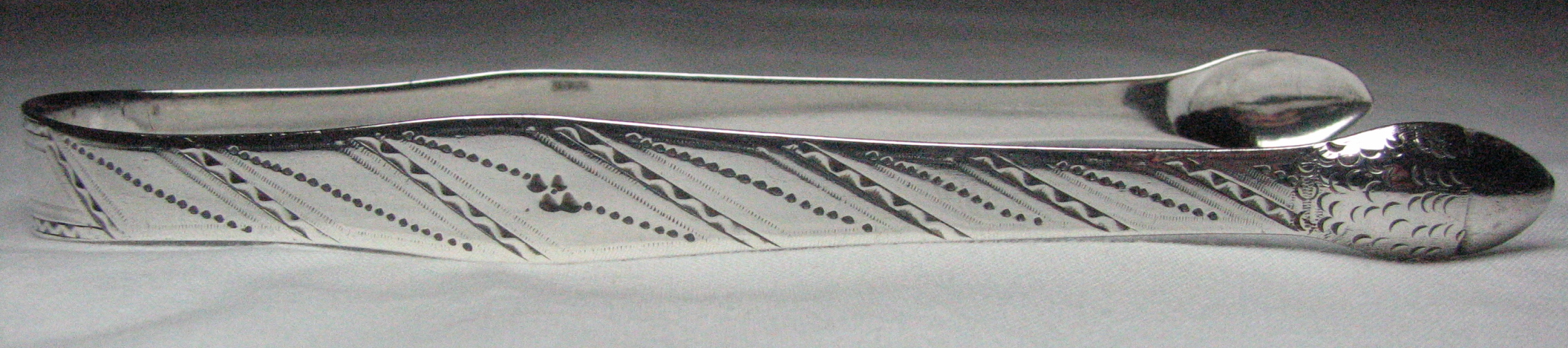 These are standard flared bright cut tongs with a lovely diagonal pattern down the length of the arms. They have acorn styled bowls, although the bowls are not shaped as is often the case with earlier ones. Notice that the duty mark and Lion Passant are punched almost on top of each other. The monogram is rather crudely engraved. This is quite common & probably demonstrates that it was engraved by someone else, after the tongs were bought. Click on any picture to enlarge |
