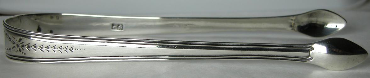 This page gives some examples of Hester Bateman silver sugar tongs covering the period 1786 to 1790. i.e. where only the maker's mark, the cameo duty mark and the Lion Passant are marked. I have deliberately shown examples of unusual or rare tongs. Most Hester Bateman tongs were flared and bright cut. Those shown here are examples of other styles she made. Click on a picture to see more details |
