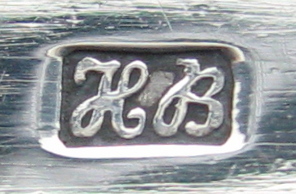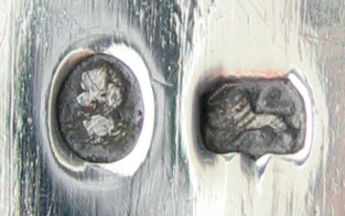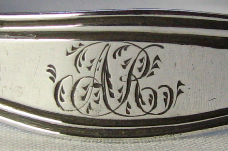 This pair of tongs is a pair of plain, flared tongs, with a double thread edge, quite an unusual style for Hester. They have a lovely engraved monogram, "AR".