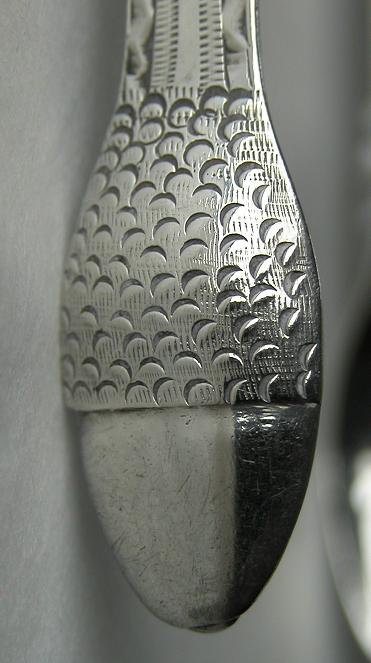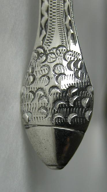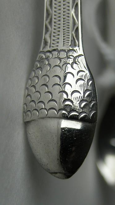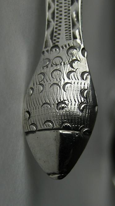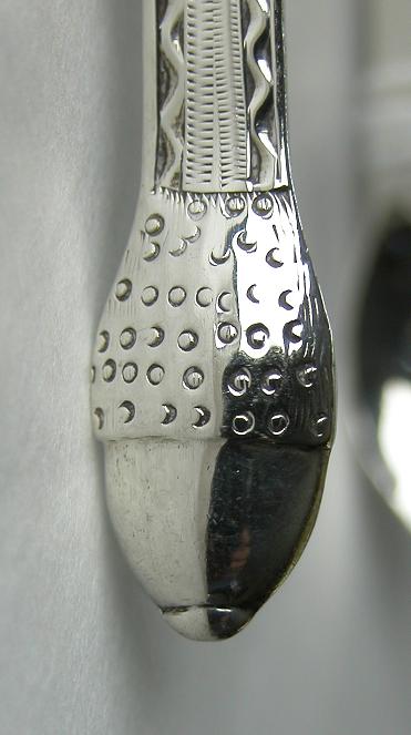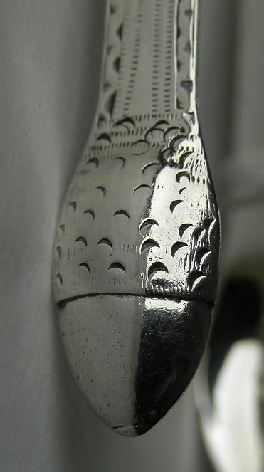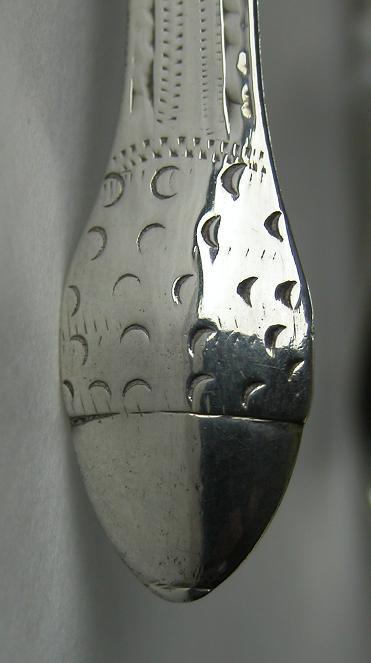 Acorn bowls are a fairly common feature of many sugar tongs of this period, and Hester Bateman is no exception. The general workmanship of these bowls is all the same but the final "look" is different with each pair of tongs. Click on any picture to enlarge |