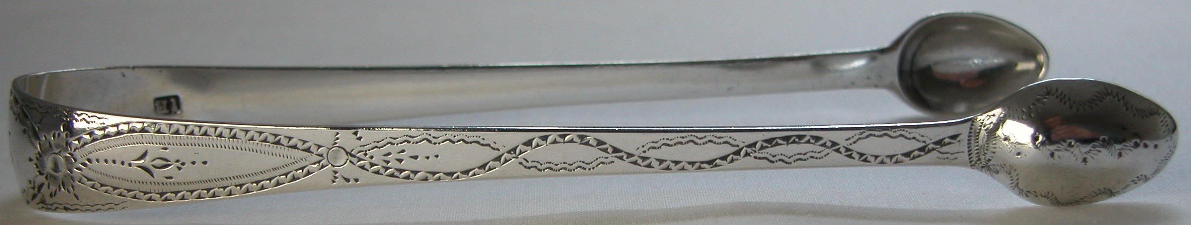 These are a fairly standard pair of bright cut tongs, dated 1790/91.