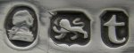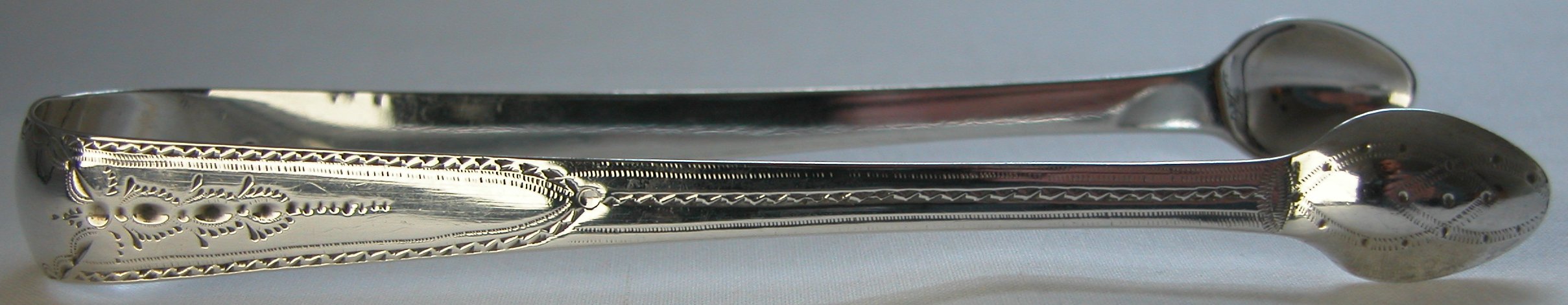 These are a fairly standard pair of bright cut tongs, dated 1794/95. These tongs have an apprentice or journeyman's mark next to the maker's mark.