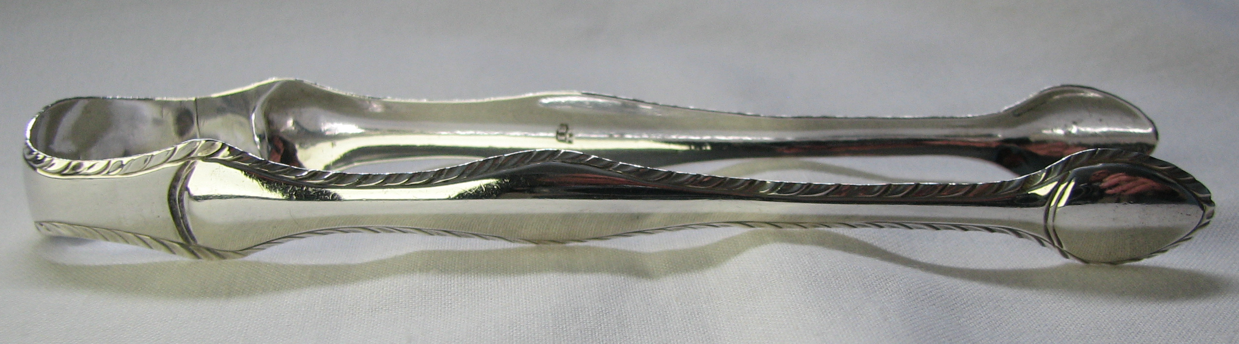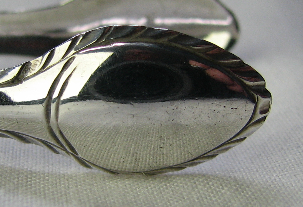 These tongs are a lovely design, concave in shape with a double flare and serated feather edges to the arms. I have dated them at c1780.