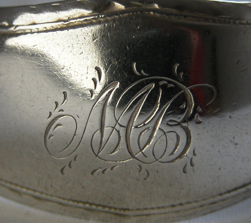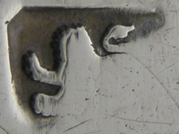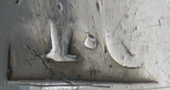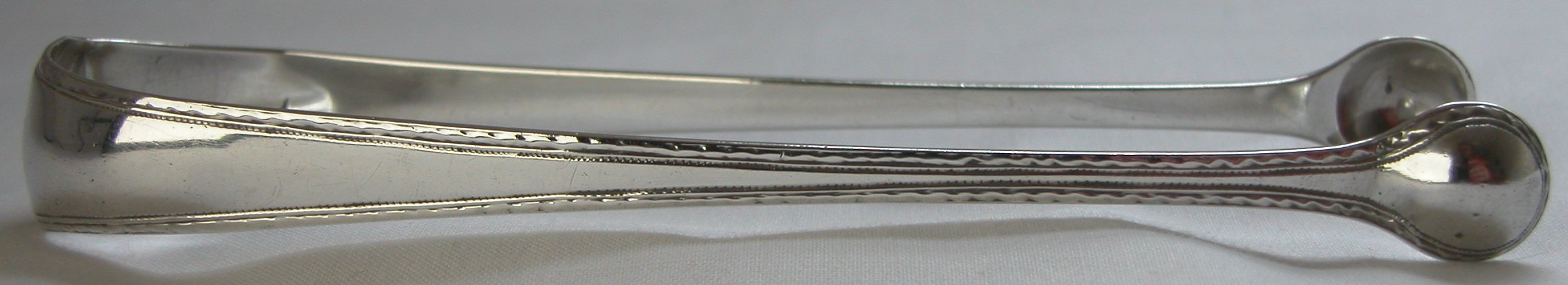 These tongs are of a plain style with just a thread edge and light bright cut engraved pattern, extending around circular bowls. The Lion Passant is very worn but still distinguishable. The maker's mark is also worn and so we cannot be absolutely certain it is "IC". In fact it could well be "TC" for Thomas Chawner and the style of the togs is similar to his work. I have dated these tongs as c1780 - 1784 Click on any picture to enlarge |