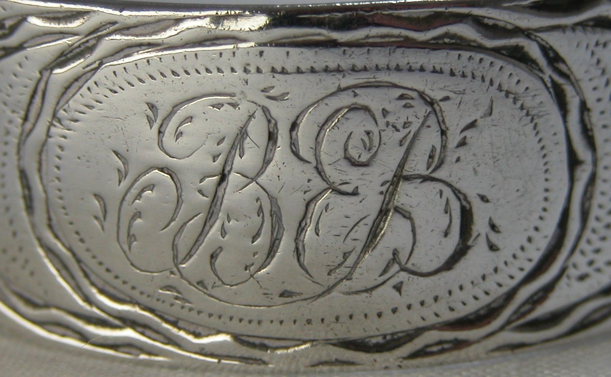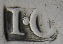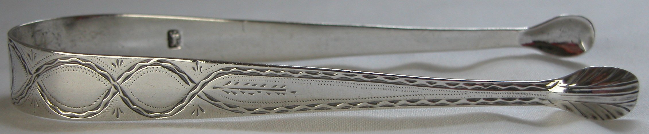 This is a beautiful pair of bright cut tongs. They have a very distinctive style with wide shoulders and lovely pear shaped bowls. There is an elaborate engraved monogram. With these tongs the maker's mark is much clearer than the first pair but probably still the same mark. Again I have dated these tongs as c1780 - 1784. These tongs may have been made by any of the registered silver-smiths of the period, the likely candidates being John Carter II or John Cormick. Click on any picture to enlarge |