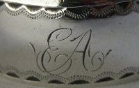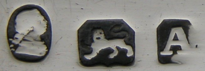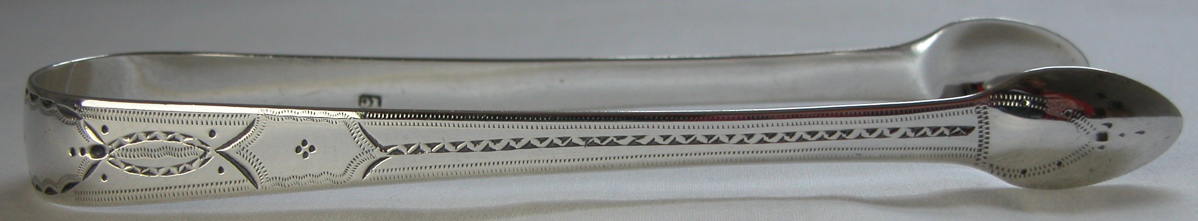 These are straight sided bright cut tongs in a fairly standard London style. This maker's mark is very different to the 2 early makers, but very similar to the 2 marks on the other 1796 and 1798 tongs. This suggests the Joshua Cooper attribution is more likely. Click on any picture to enlarge |