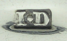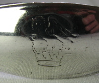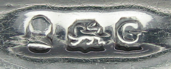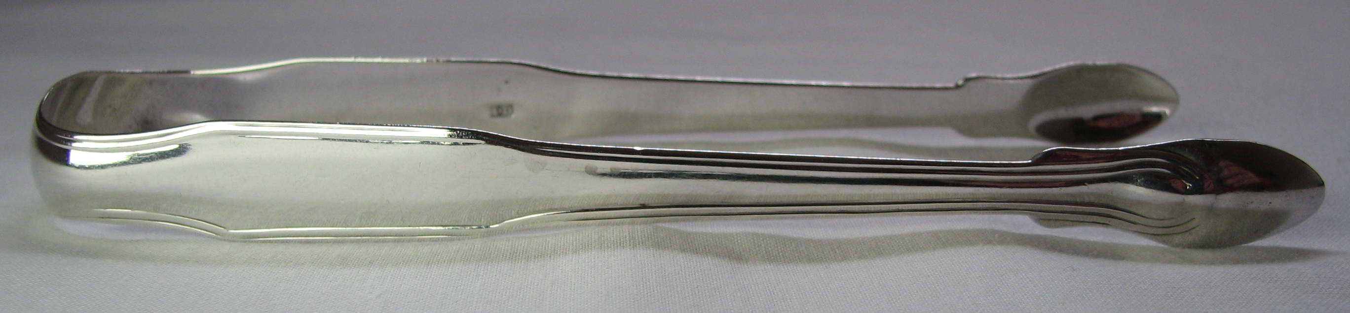 These tongs are fiddle & thread pattern but with a slightly unusual shape. This shape is more normally seen with Irish tongs but Irish fiddle pattern are generally a little more angular with there being less smooth curves. These tongs are also blessed with a delightful (if a little faded) monogram of some sort of winged beast perched on a crown. These tongs are dated 1802/03, i.e. some time before the end of May 1803. Note that John Death did not register a mark until July 1803. Click on any picture to enlarge |