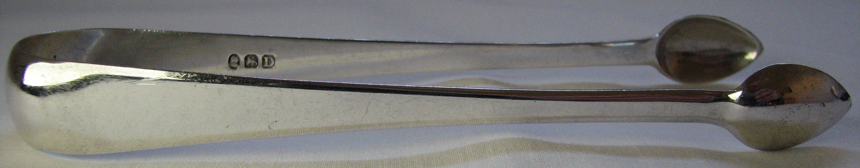 These tongs are dated 1799/1800 and are plain, Old English style with pronounced bevelled edges to the arms and no monogram.