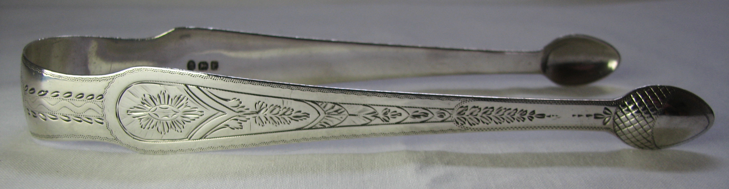 This is a lovely pair of bright cut tongs. They are unusual, just because of the size of them. They are 6.¼ inches long and weigh 52.5 grams. This is a huge size for tongs of this date. The engraving is very fine and in fact appears as if it has been machine engraved, rather than by hand. Again this is unusual as machine engraving is not normally seen much before about 1810. They are dated 1801/02. Click on any picture to enlarge |