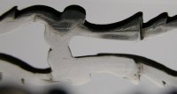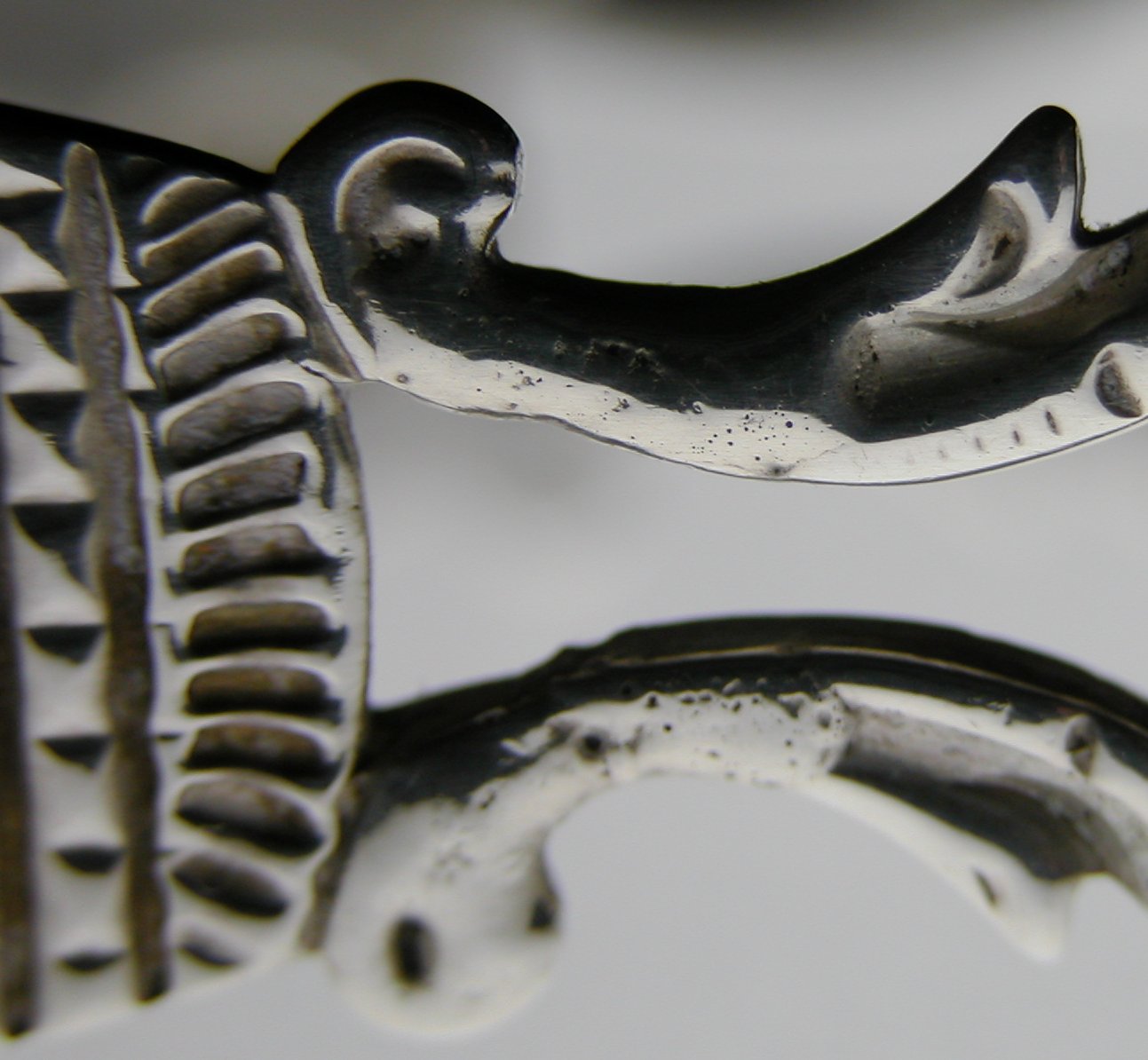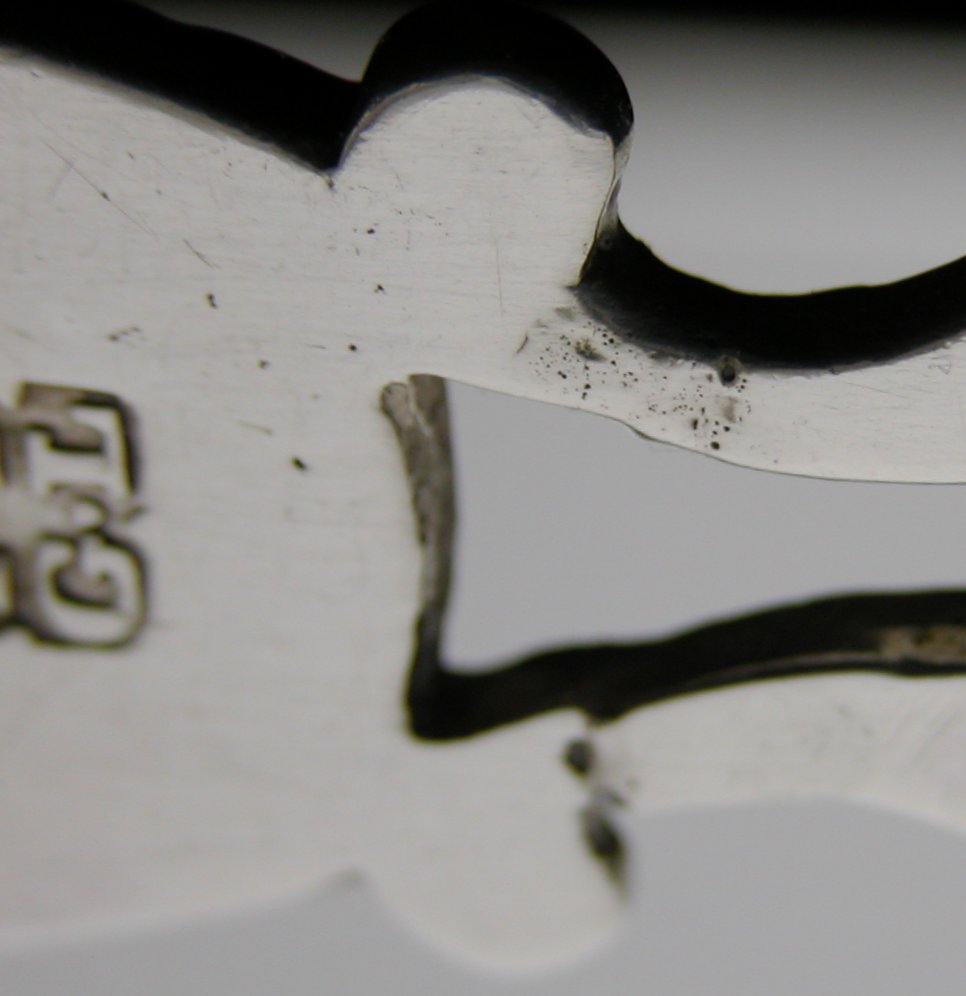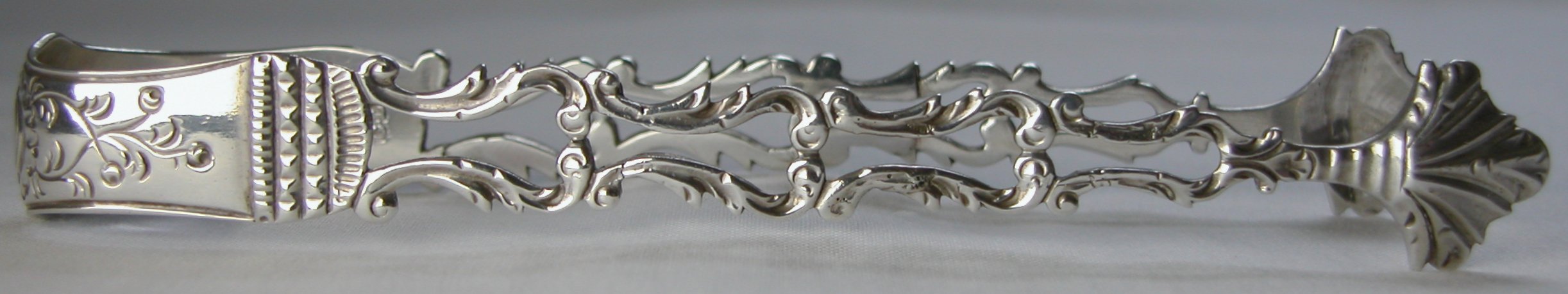 These are a pair of cast tongs. They are a lovely pattern with unusual shaped shell bowls and lovely clear maker's mark. Unfortunately they have three repairs. The repairs are of excellent quality and difficult to detect from the outside. The repairs are very clear from the inside, a plate repair on each arm, where the arms have been broken and repaired by inserting a plate underneath. They have also had one arm re-soldered back onto the bow. again the repair is hard to see, but is nevertheless there. These tongs are a good example of how difficult it can be to detect repairs. Click on any picture to enlarge |