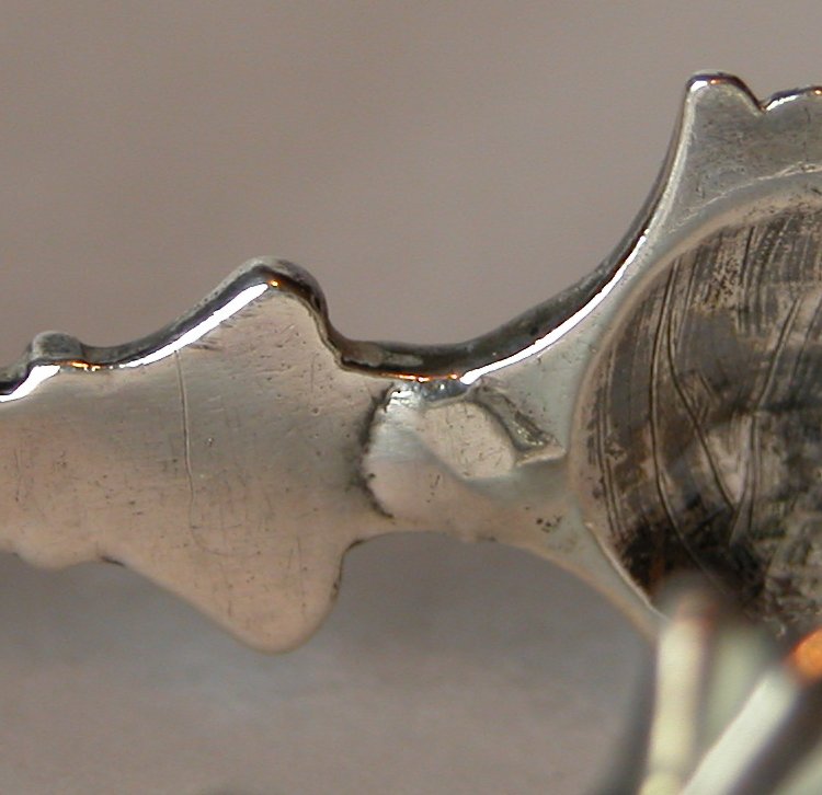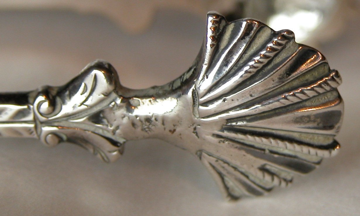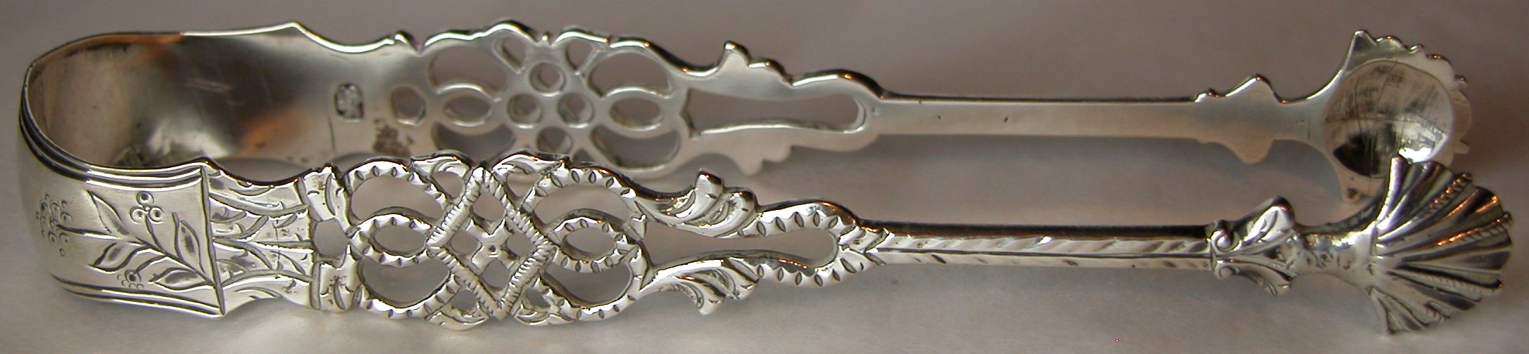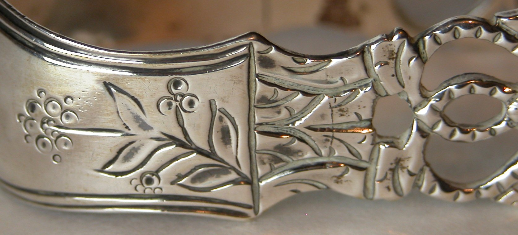 These are a very nice pair of cast tongs. The bottom half of the arms is quite unusual, being so narrow. They are decorated with the now familiar flower and leaf pattern in the Adam style. As ever, there is a repair, this time where the bowl joins the arm. In this particular case I suggest that this is not really a problem. It is fairly well soldered & the rest of the tongs are in excellent condition. Click on any picture to enlarge |