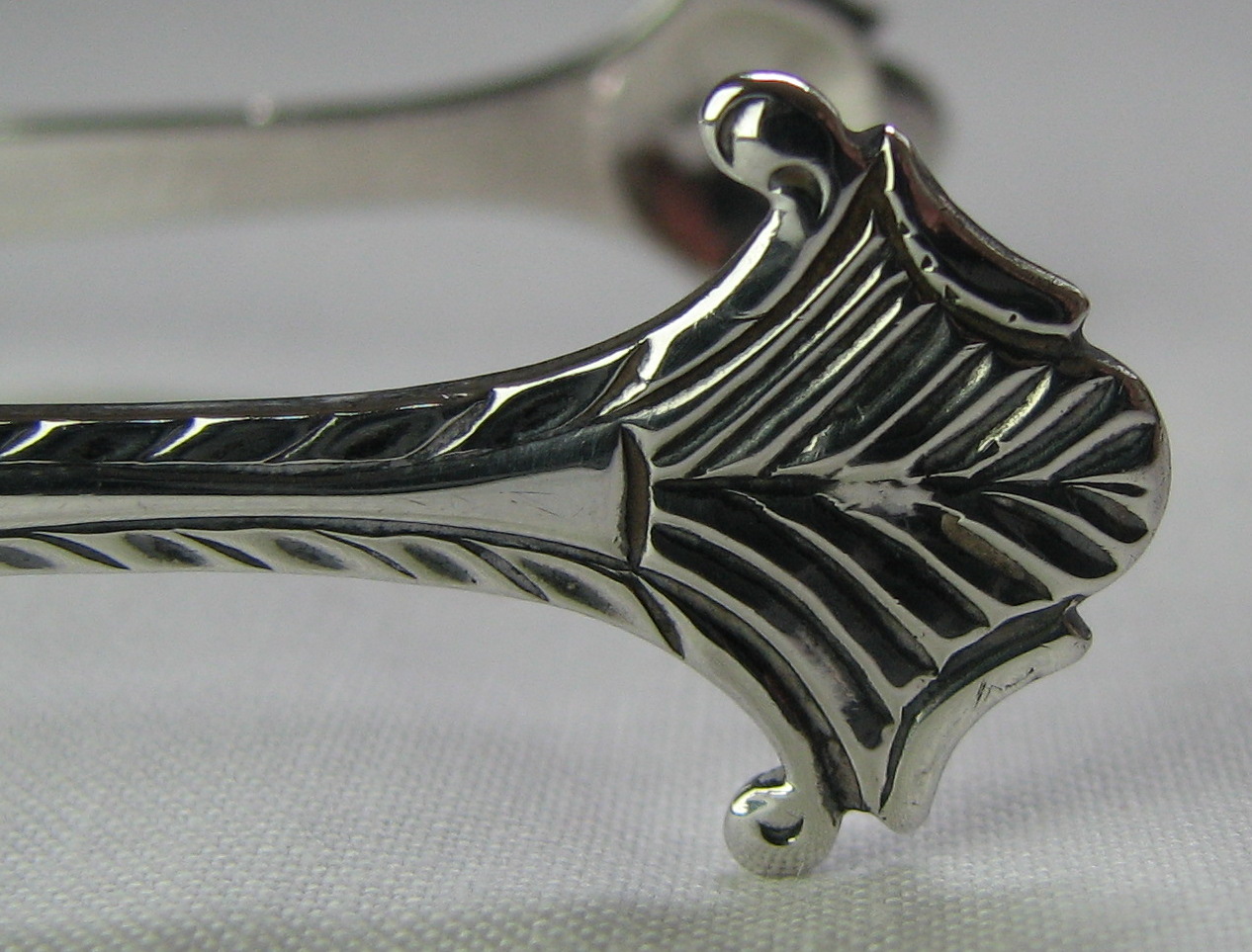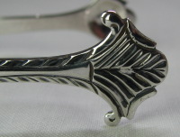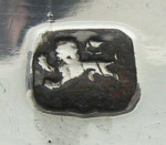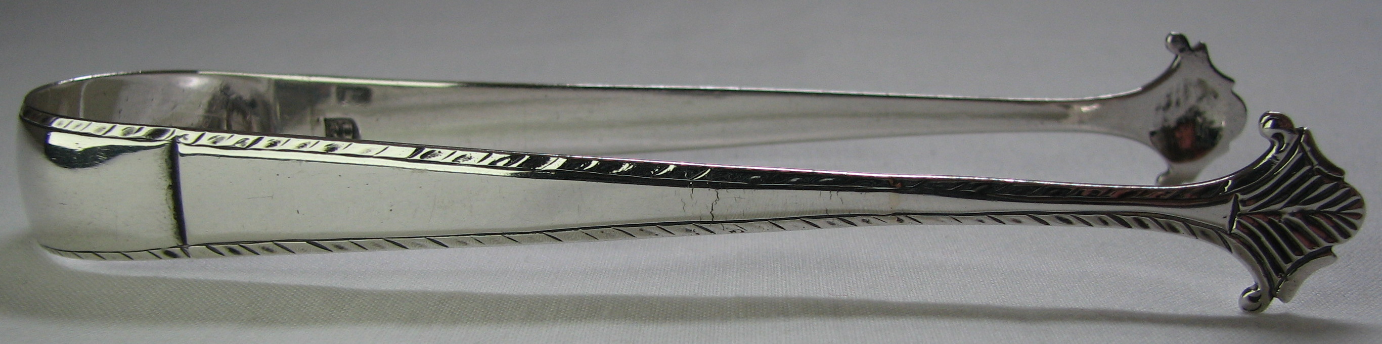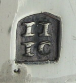 John Jones & John Chadwick registered a mark as buckle-makers on 30th May 1775. Grimwade reports of John Jones II, who was apprenticed to Samuel Wood and goes on to suggest that this may be the John Jones who was registered as a buckle-maker. These tongs are cast in three parts, with a nice styled bowl and were made c1775, perhaps only shortly after the partnership had registered their mark. Their mark is in a curious punch with the top of the punch “curved”. Unfortunately the tongs have been repaired, but the repair is an excellent one & does not significantly detract from the tongs. Tongs with this maker's mark are very rare. Click on any picture to enlarge |