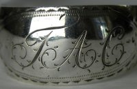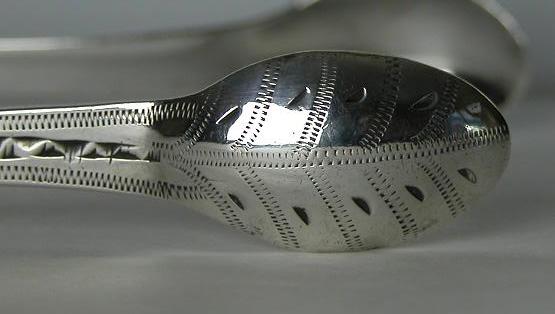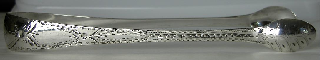 These sugar tongs are fairly standard London bright cut tongs with a very elaborate engraved monogram. They are dated 1796/97.