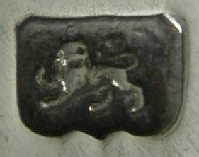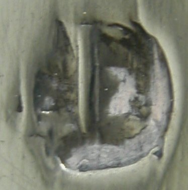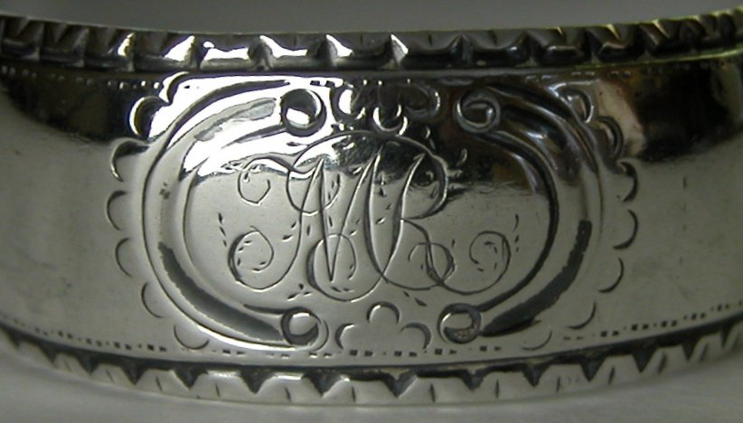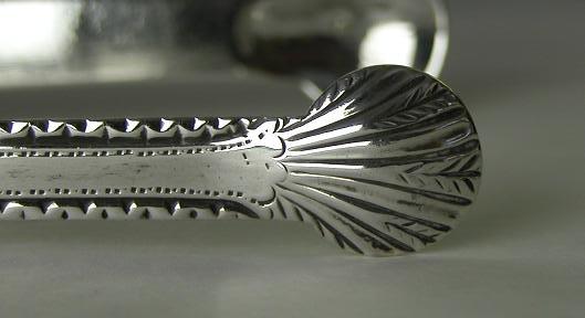 This pair of sugar tongs are an early example of true feather edge tongs. They have lovely circular deep cut engraved bowls and engraved monogram. The engraving on these tongs is standard engraving, rather than bright cut engraving. Many thanks to Vic Bowman for deciphering the maker's mark on these tongs. Click on any picture to enlarge |