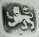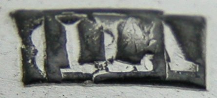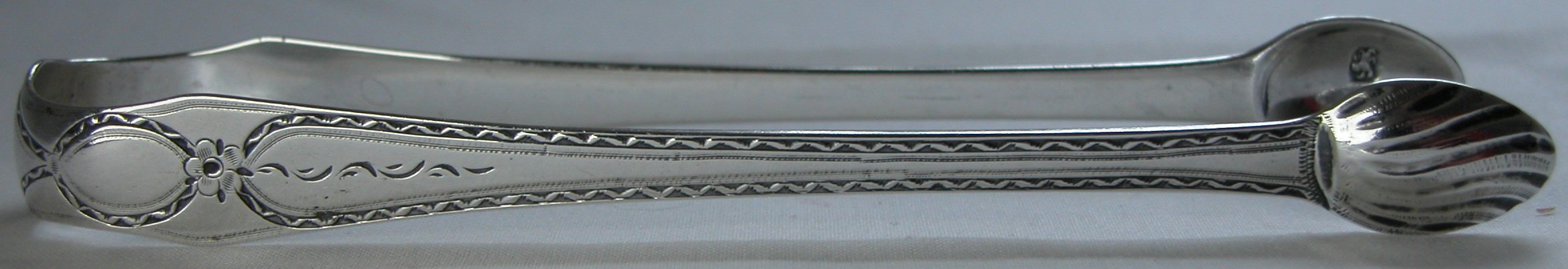 This is a pair of styled, bright cut tongs. John Lambe is known for the variety of styles and shapes of his tongs. The flare on these tongs is almost at the shoulder. Notice that he has over-struck another maker, again showing that he did not make these tongs himself. Click on any picture to enlarge |