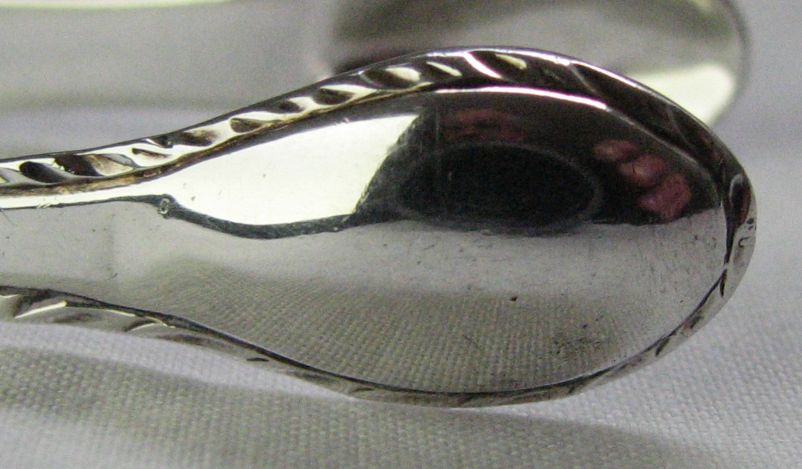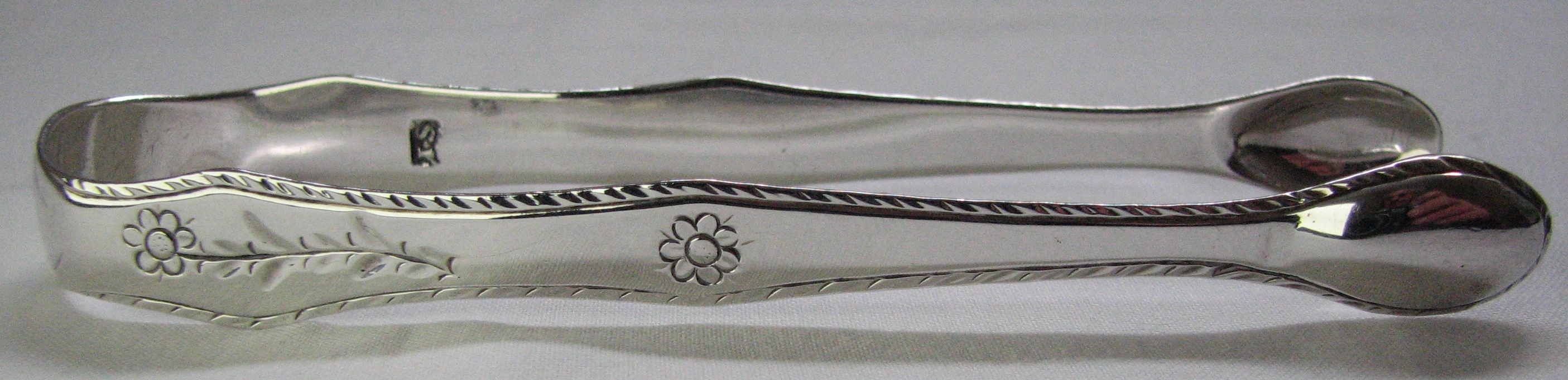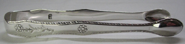 The attribution of these tongs to James Stamp is not certain as there were several makers of this period with the maker's mark of "IS". These tongs are a delightful example of bright cut engraving in the "Adam" style. They have a lovely feather edge as well. I have tentatively dated them at c1775 - 1780. Click on a picture for more details |