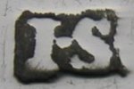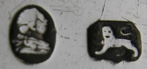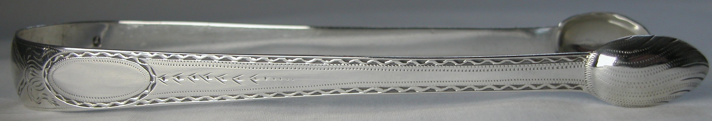 These are of a fairly standard style of bright cut tongs. This mark is a very small rectangular mark with a pellet. Dated 1790/91.