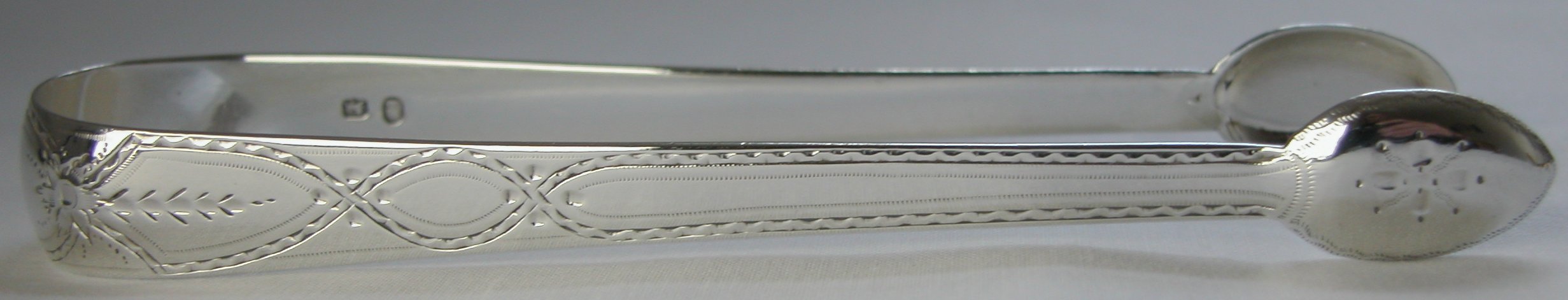 These are of a fairly standard style of bright cut tongs. Dated between 1790/91.