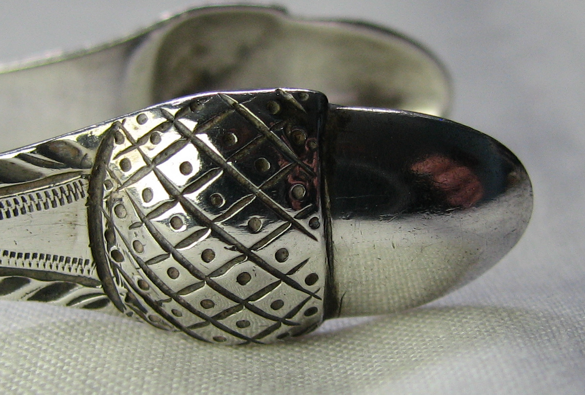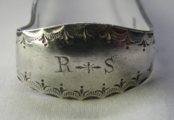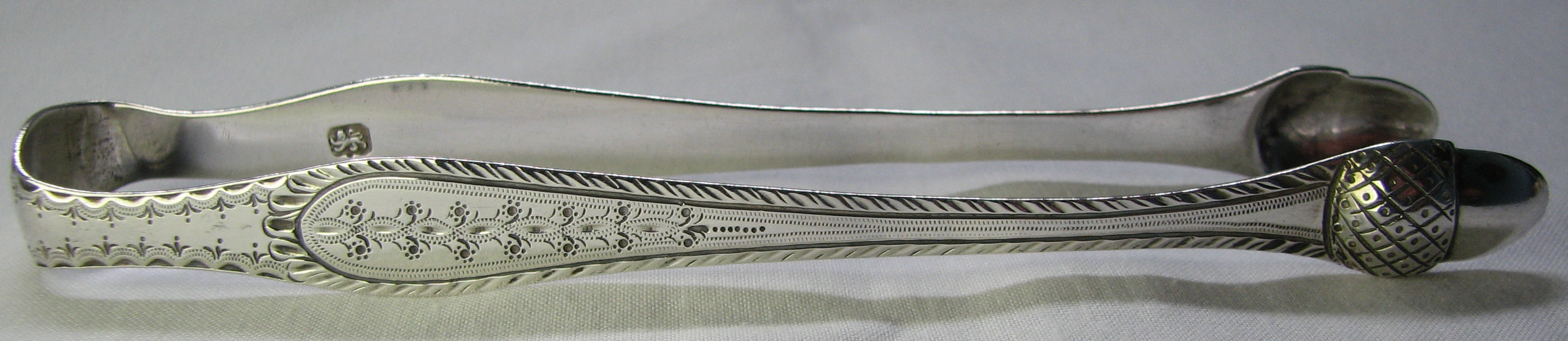 These are a superb pair of early bright cut tongs with a flared shape to the arms and an Adam style engraved chain of flowers to the sides of the arms. They have a delightful shaped acorn bowl. Sadly one arm is slightly out of shape, otherwise they are a stylish early pair of bright cut tongs. They are dated 1782-1784. Click on any picture to enlarge |