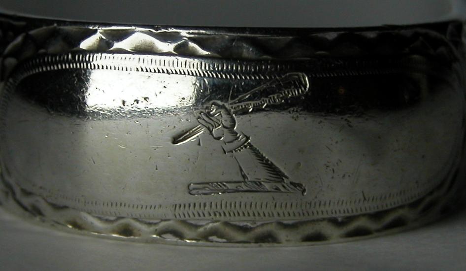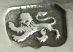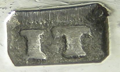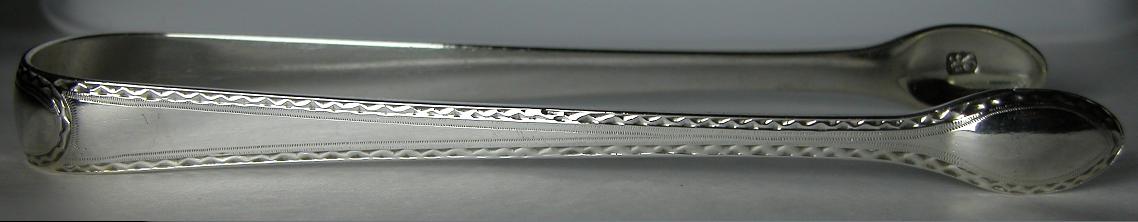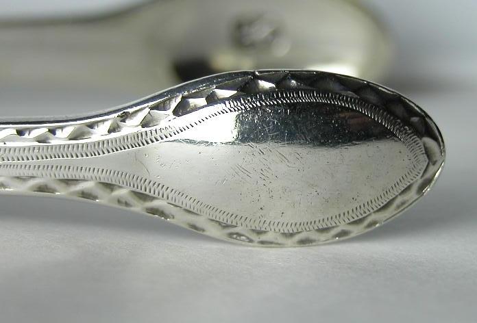 These tongs are bright cut with a feathered edge, marked in the bowls, with a delightful monogram of an arm holding a club.