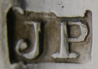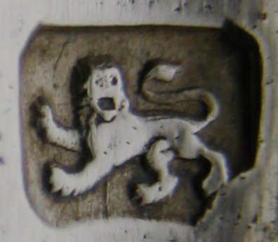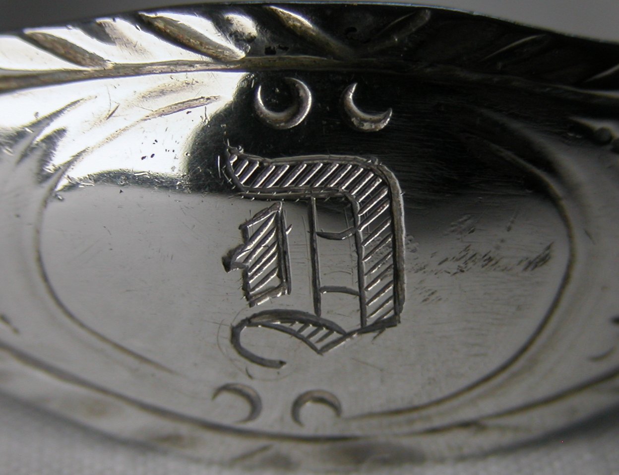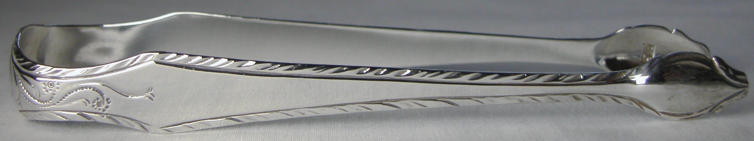 These tongs have a lovely feather edge to them. Although I have dated them as c1780, they are not bright cut and could therefore be dated a little earlier. They are engraved with an "Adam" style flower pattern. The bow is shaped and the bowls are also slightly shaped by an extension of the feather edging. This pair show a very close similarity to another pair, also shown here. They are marked in the bowls. Notice that the maker's mark is identical on the two pairs of tongs. Click on any picture to enlarge |