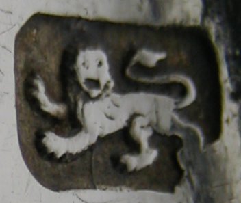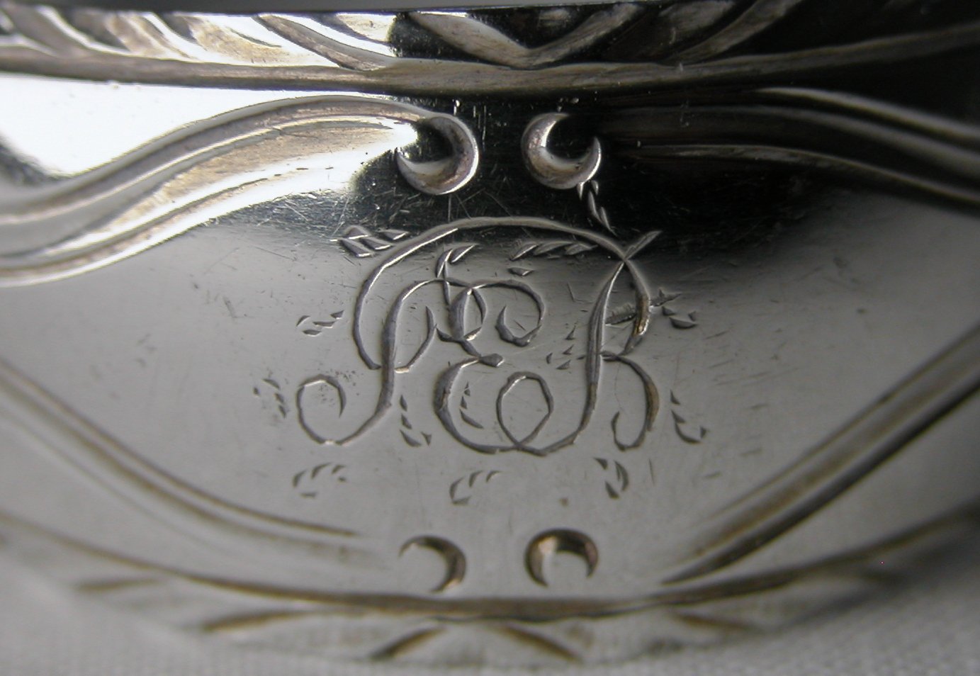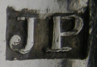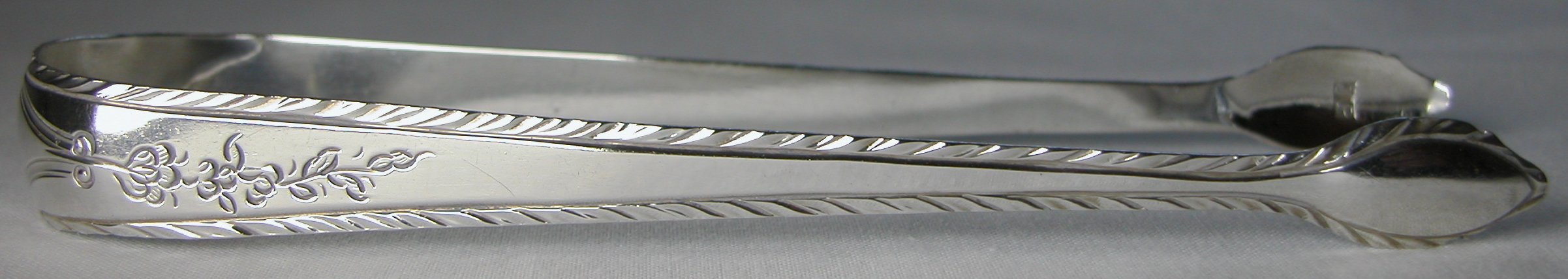 These tongs have a lovely feather edge to them. Although I have dated them as c1780, they are not bright cut and could therefore be dated a little earlier. They are engraved with an "Adam" style flower pattern. This pair of tongs are very similar to another pair shown here, even though this pair do not have a shaped bow. They are marked in the bowls. The maker's mark is clearly identical on these two pairs of tongs. Click on any picture to enlarge |
