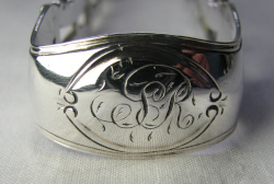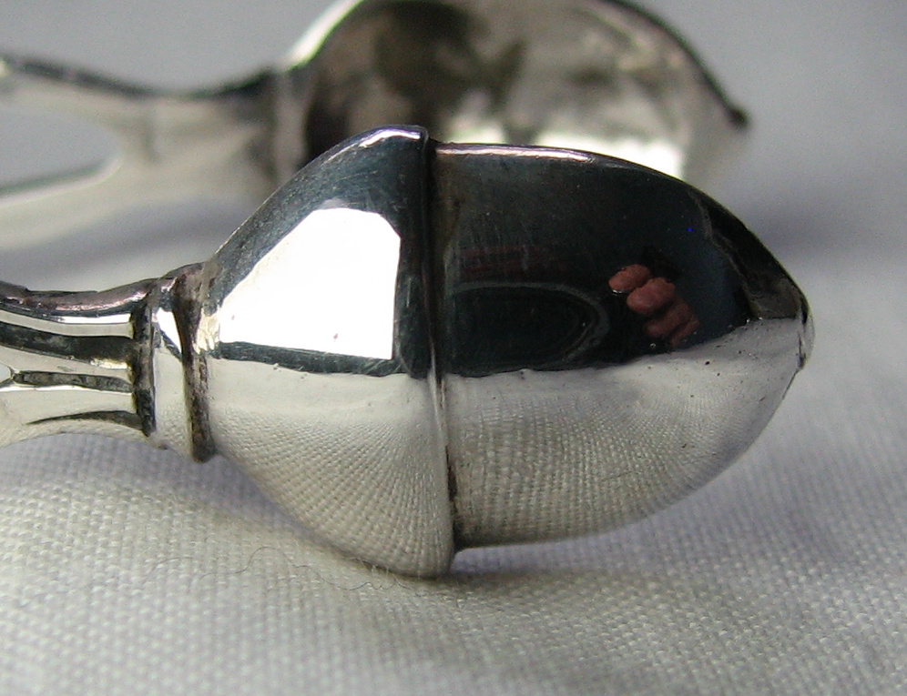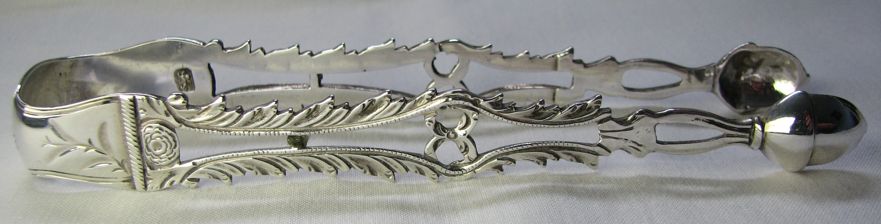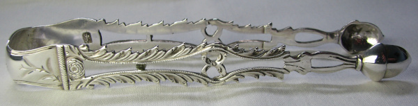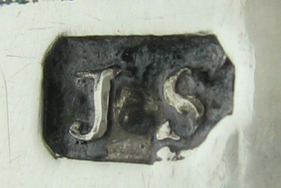 John Scofield was a renowned Plate-worker. His surname is often spelled "Schofield" but his signature has no "h" in it. His first mark was enetered as a plate-worker, in partnerhsip with Robert Jones, on 10th February 1776. He then entered a second mark, alone on 13th January 1778. Although he is well known for his candle-sticks and candelabra, there appears to be no other maker registered with the initials of "JS" around this time. I have therefore attributed these tongs to John Scofield, although, as always, I could be wrong. These tongs are cast tongs, and of the expected style for the late 1770's. I have therefore dated them at around 1778, when he registered his fiorst mark alone. Click on any picture to enlarge |