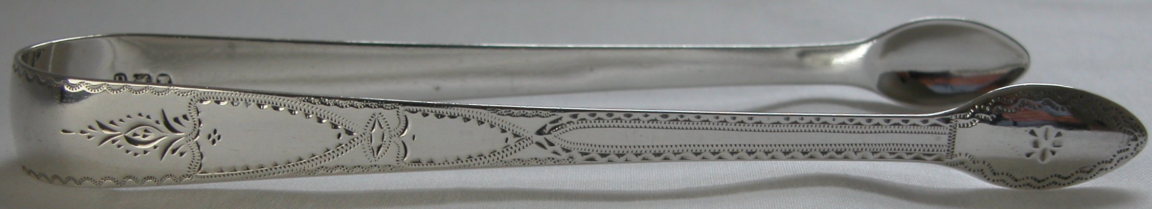 Miles Askew registered a mark on 30th September 1784 as a small-worker. There is a reference to a Joseph Askew in partnership with William Judd, as buckle-makers, in 1788. This may be related. Tongs by Miles Askew are rare. This a pair of fairly standard bright cut tongs, dated 1795/96. Click on any picture to enlarge |
