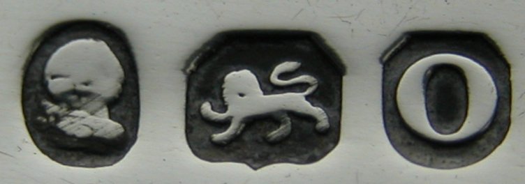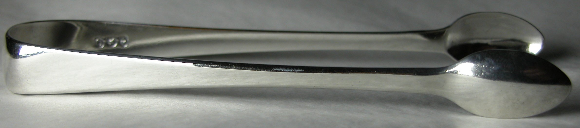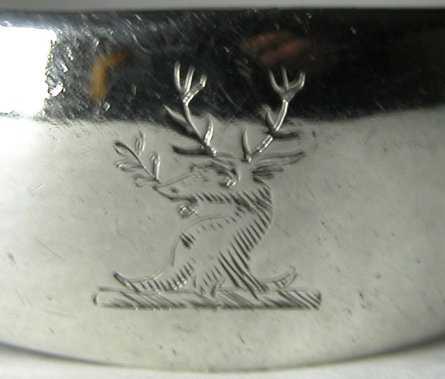 This pair of tongs have the date letter “O”, dating them between 31st August 1809, (when they first registered the mark together), and 29th May 1810. The maker's mark is the earlier mark, in the oval cartouche. They are a simple plain pair of tongs but have a lovely monogram of a stag with a branch in his mouth. Click on any picture to enlarge |