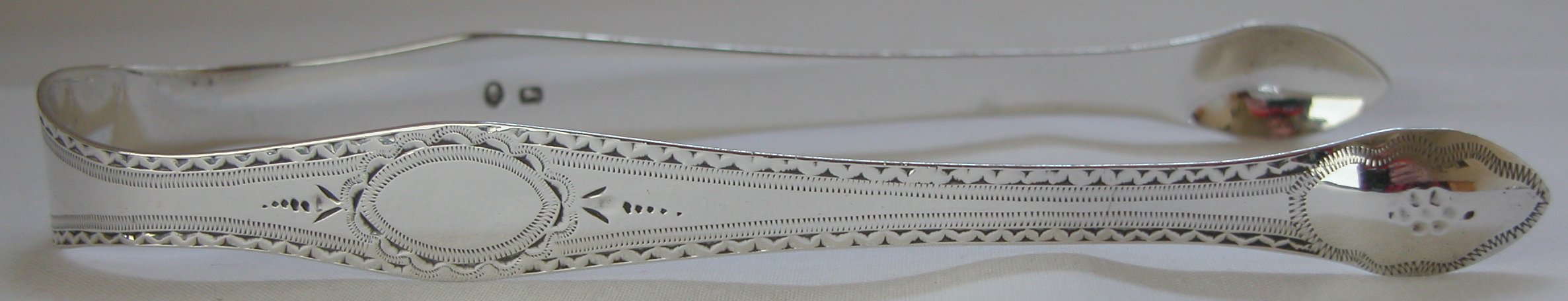 This pair of sugar tongs are dated 1791 and are a good example of the flared, shaped style of sugar tongs. They are particularly interesting as they have no date letter. The date letter was introduced on 29th May 1791 and Peter & Ann started working together on 2nd May 1791. This enables us to date these very accurately - as one of the very first pairs of sugar tongs they made together! Click on any picture to enlarge |