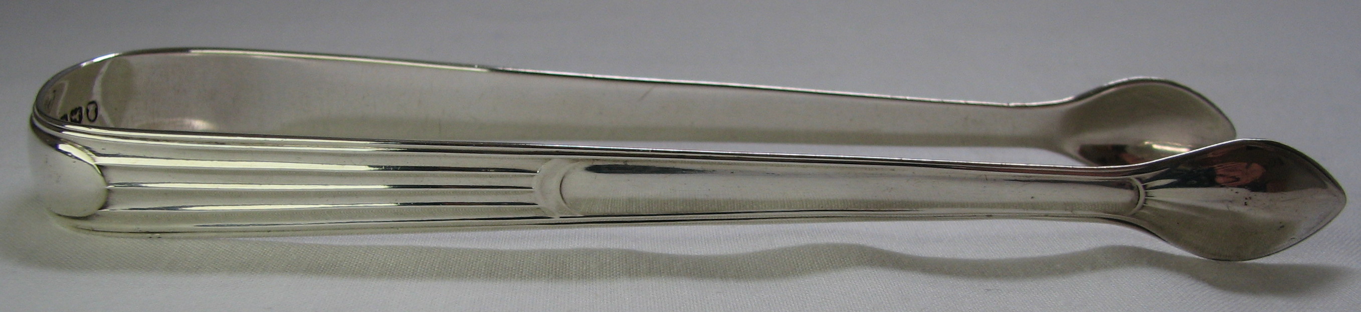 This pair of tong is the most common Bateman style of tongs. All of the partnerships made tongs in this "classical" fluted style (except perhaps Hester). This particular pair is unusual in that the Assay Office have struck the hallmark on top of the maker's mark. This is very un-common. It just demonstrates that perhaps the Assay Office were not always perfect! Click on any picture to enlarge |