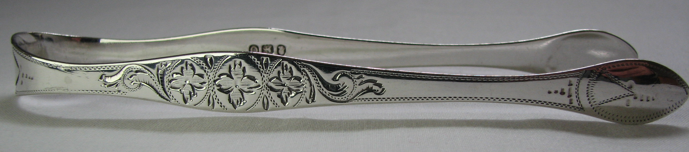 This is a pair of flared, bright cut tongs. This style of tongs is a very common Bateman style, with typically pointed bowls. They are dated 1809/10.